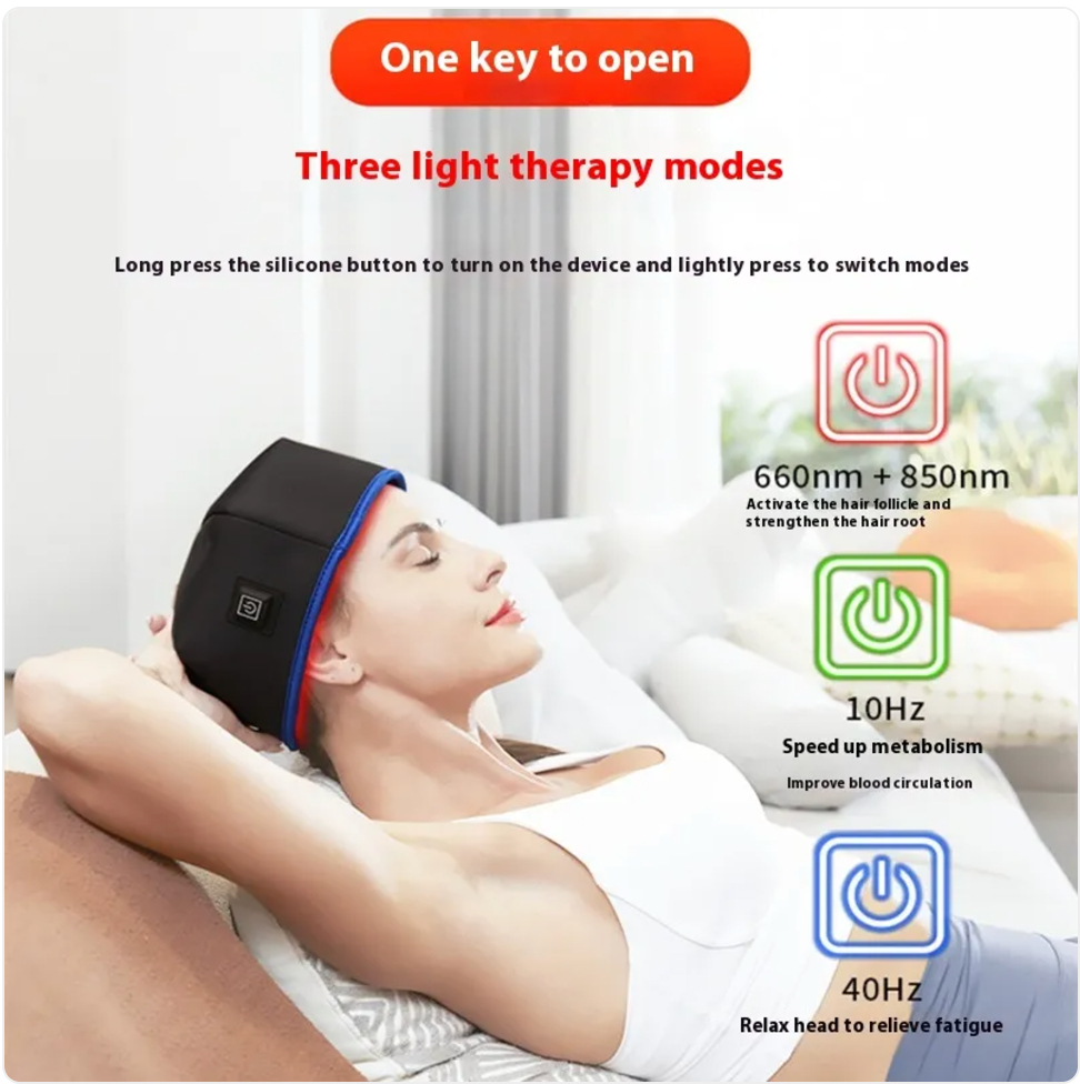 The cap uses red and infrared LED light designed to support scalp health and stimulate hair follicles.